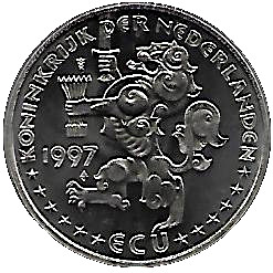 Описание: Геральдичний лев Королівства Нідерландів. Лев, що стоїть на задніх лапах, тримає меч і 7 стріл. Написи та 12 зірок по колу. Приватний знак у вигляді лука.