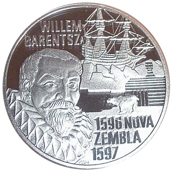 Описание: Зліва — профіль Віллема Баренца. Справа — його корабель, застряглий у льодах Нової Землі, разом із ведмедем, що стоїть на крижаній воді.