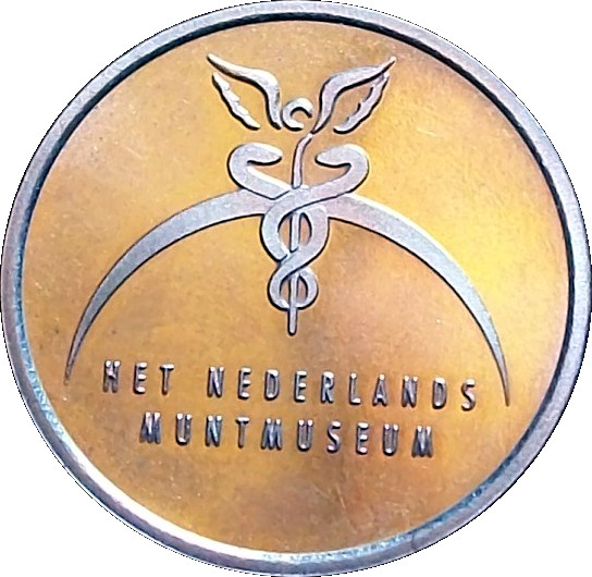 Описание: Ліва частина: вежа будівлі Королівського монетного двору Нідерландів (Koninklijke Nederlandse Munt), тканинні знаки — кадуцей та лук і стріла (mercuriusstaf en pijl met boog). Права частина: напис та рік.