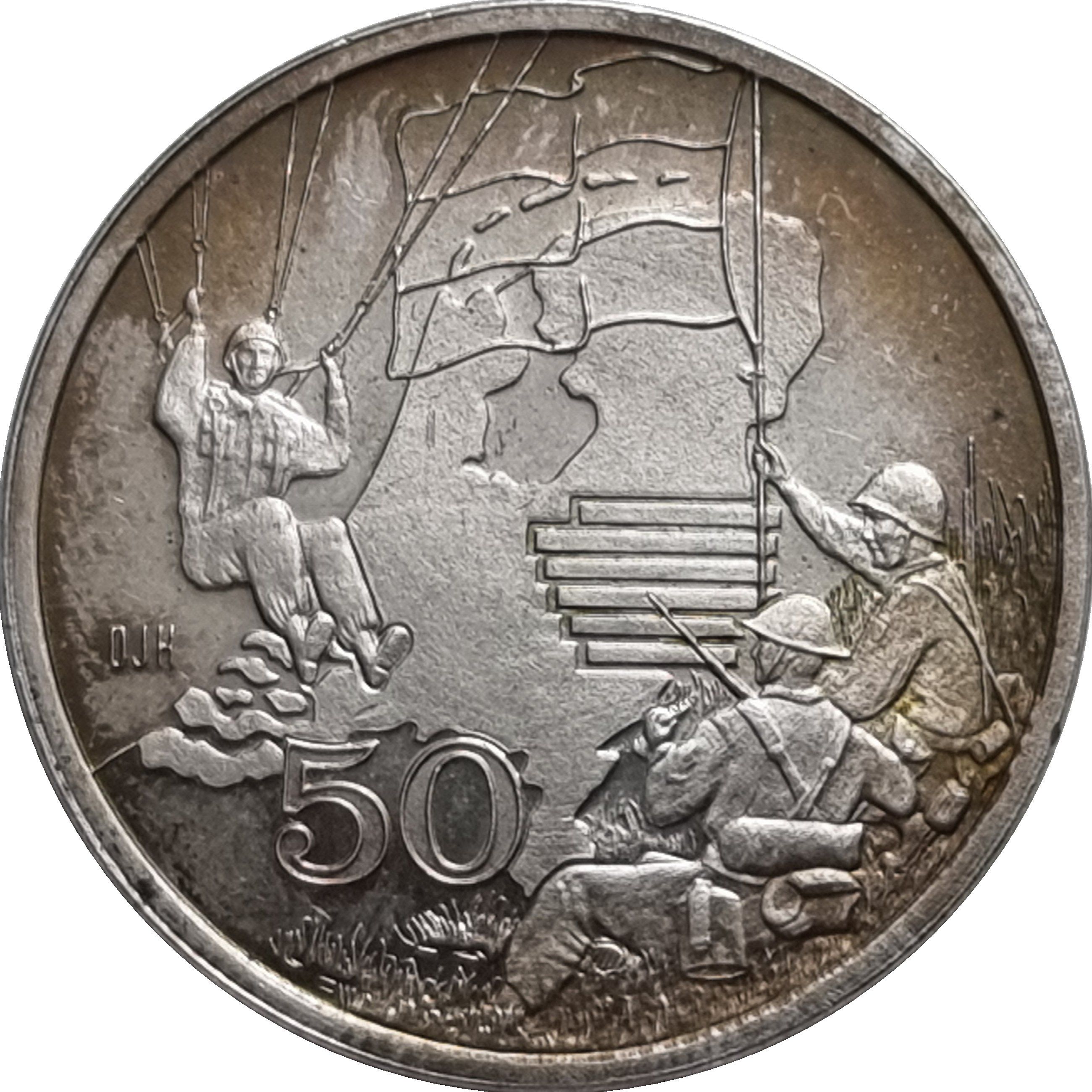 Описание: Десантник, який збирається приземлитися, ліворуч. Двоє солдатів сидять праворуч, один з них тримає прапор Нідерландів, все це на тлі карти, на якій показані кордони Нідерландів.