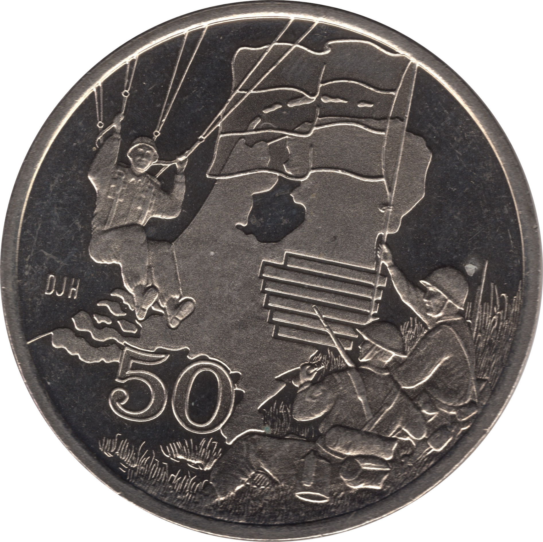 Описание: На тлі — карта Нідерландів. Зліва — десантник, що приземляється, праворуч — двоє солдатів, один з яких тримає прапор. Ініціали дизайнера.