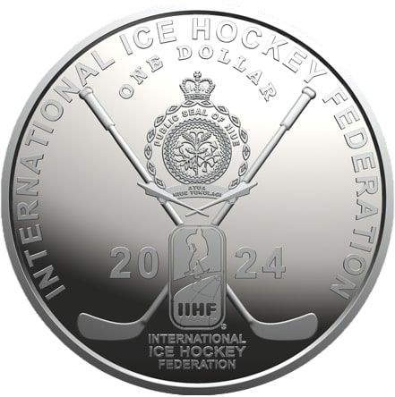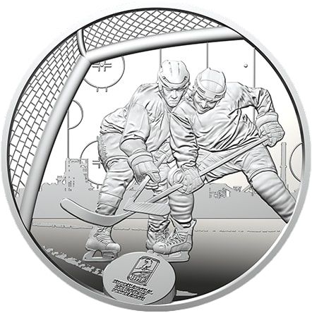 Описание: Герб с двумя скрещенными хоккейными клюшками и официальным логотипом IIHF