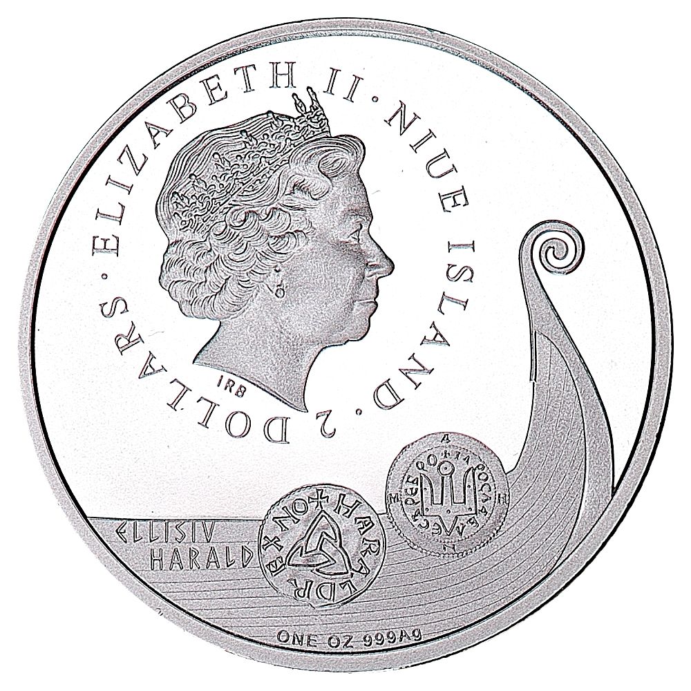 Описание: Королева Елизавета II, корабль викингов, монета Харальда Хардрады (1045-1066) и Ярослава Мудрого (1019-1054)