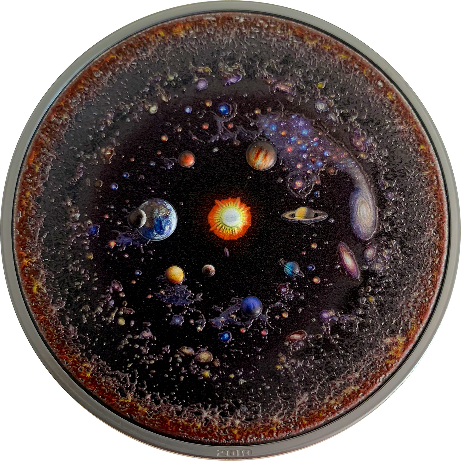 Описание: Вся наблюдаемая Вселенная: представленная художником в логарифмическом масштабе концепция наблюдаемой Вселенной с Солнечной системой в центре, галактиками, космической паутиной и невидимой плазмой Большого взрыва на краю.