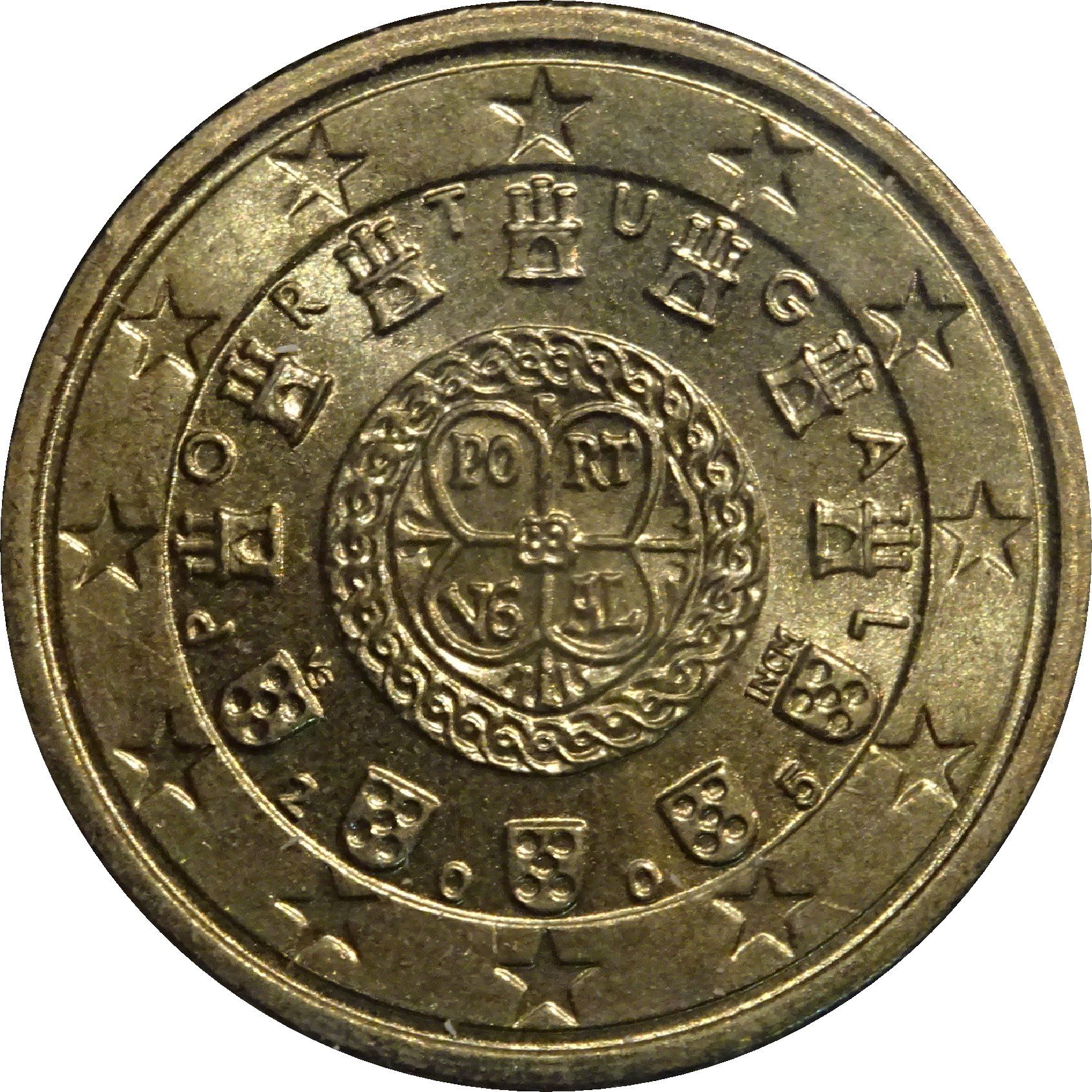 Описание: Друга королівська печатка 1142 року Афонсу Енрікеша, першого короля Португалії, оточена по черзі сімома замками країни та п'ятьма гербами, які зображені на португальському прапорі, а також літерами слова «PORTUGAL», які оточені дванадцятьма зірками Європи.
