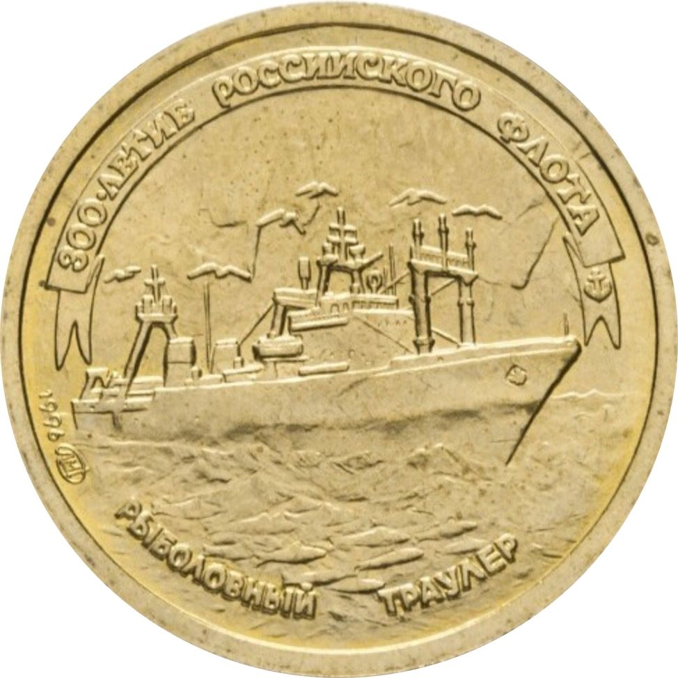 Описание: Зображення риболовного траулера, написи по краю: вгорі на стрічці — «300-ЛЕТИЕ РОССИЙСКОГО ФЛОТА» (300-РІЧЧЯ РОСІЙСЬКОГО ФЛОТУ), внизу — «РЫБОЛОВНЫЙ ТРАУЛЕР» (РИБАЛЬСЬКИЙ ТРАУЛЕР), ліворуч — знак монетного двору, праворуч — дата «1996».