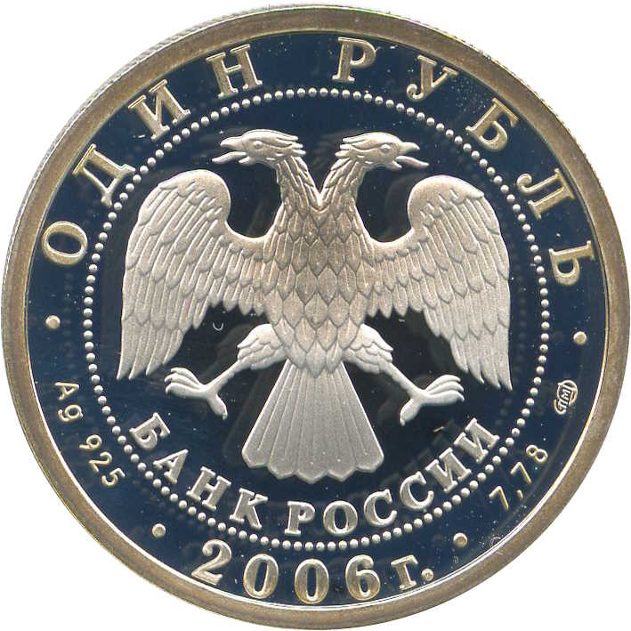 Описание: У центрі — емблема Банку Росії [двоголовий орел із розпростертими крилами, нижче — напівкругла напис — «БАНК РОССИИ» (БАНК РОСІЇ)] в обрамленні кола з крапками та написами по краю: зверху — «ОДИН РУБЛЬ» (ОДИН РУБЛЬ), внизу – рік випуску «2006», літери ліворуч позначають метал і пробу, праворуч – вміст дорогоцінного металу і знак монетного двору.
