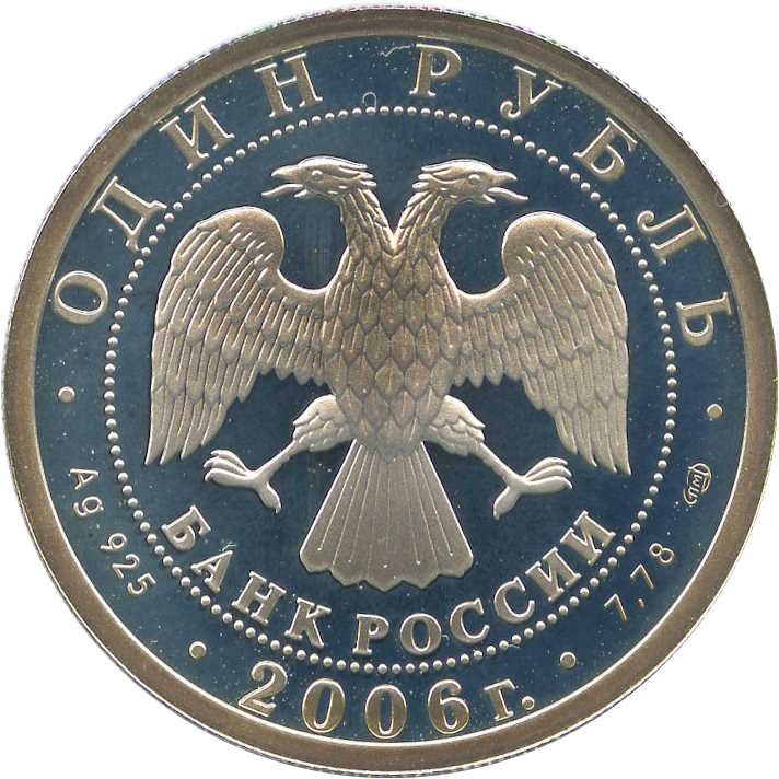 Описание: У центрі — емблема Банку Росії [двоголовий орел із розпростертими крилами, нижче — напівкругла напис — «БАНК РОССИИ» (БАНК РОСІЇ)] в обрамленні кола з крапок і написів по краю: зверху — «ОДИН РУБЛЬ» (ОДИН РУБЛЬ), внизу – рік випуску «2006», літери ліворуч позначають метал і пробу, праворуч – вміст дорогоцінного металу і знак монетного двору.