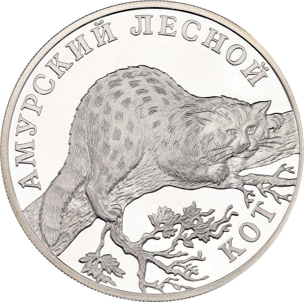 Описание: Рельєфне зображення лісового кота, що лежить на гілці дерева. Напис по краю: «АМУРСКИЙ ЛЕСНОЙ КОТ» (АМУРСЬКИЙ ЛІСОВИЙ КІТ).