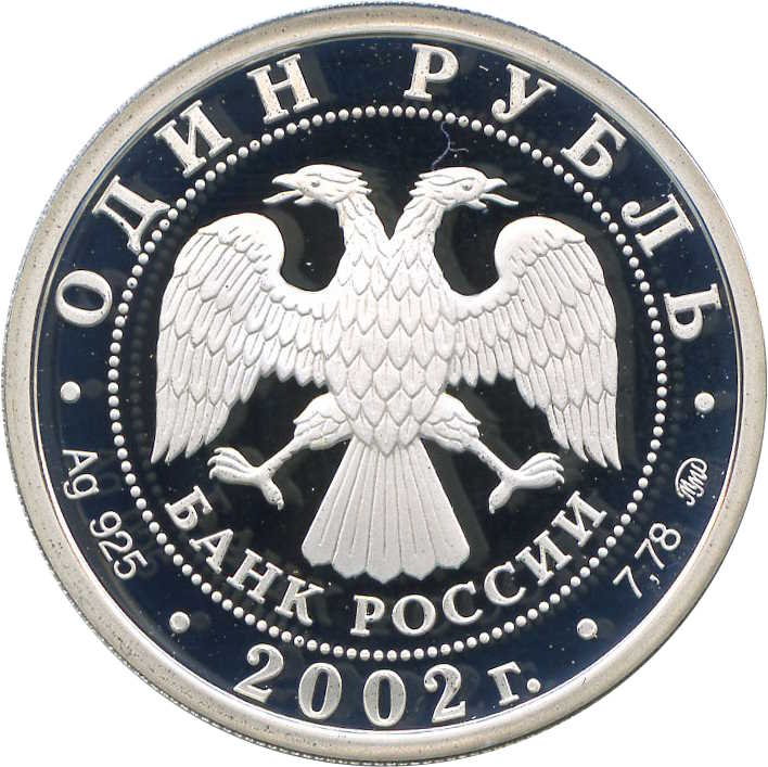 Описание: У центрі — емблема Банку Росії [двоголовий орел із опущеними крилами, нижче — напівкруглий напис «БАНК РОССИИ» (БАНК РОСІЇ)], обрамлена колом з крапок і написів по краю: зверху — «ОДИН РУБЛЬ», внизу - рік випуску «2002», літери ліворуч позначають метал і пробу, праворуч - вміст дорогоцінного металу і знак монетного двору.