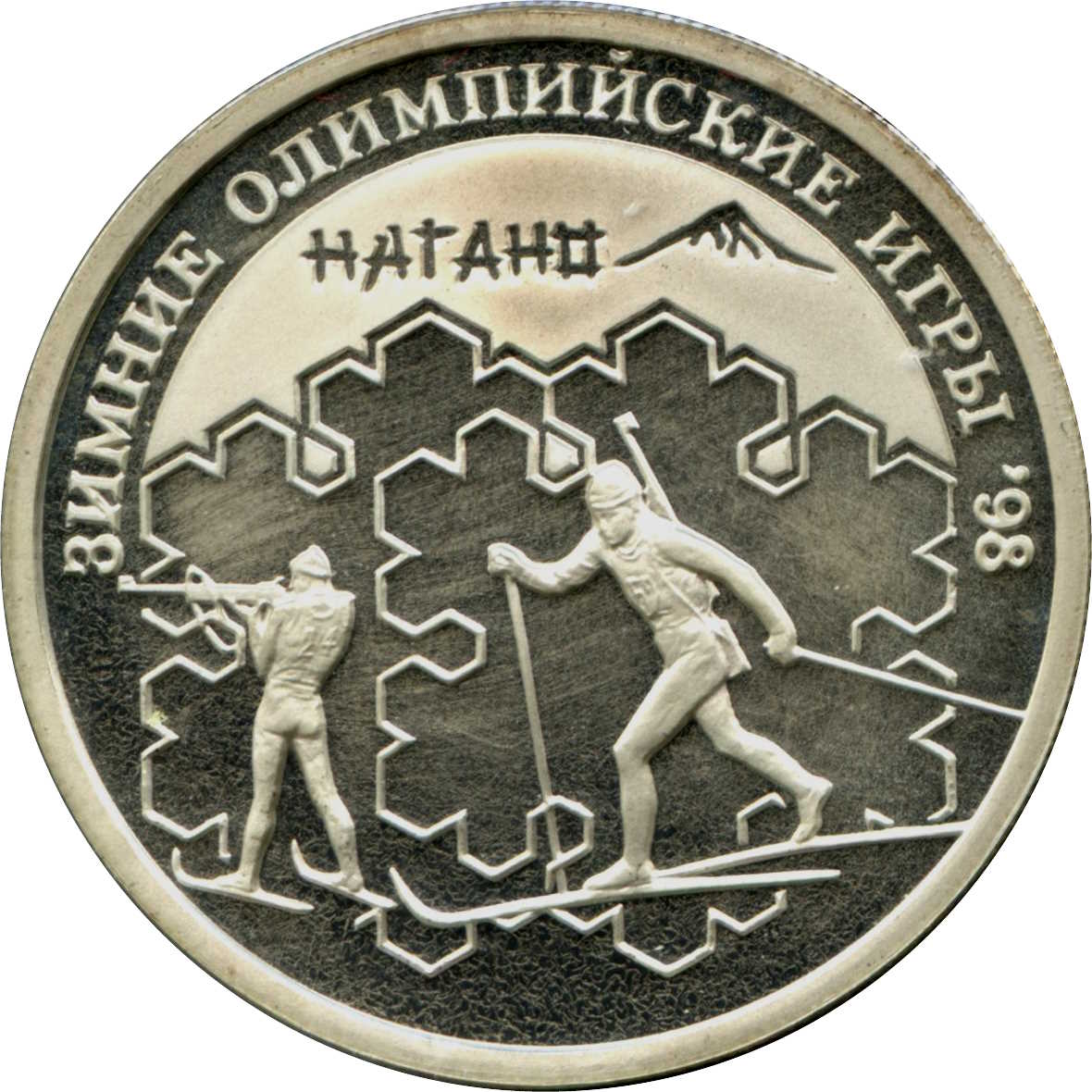 Описание: Зображення двох біатлоністів — один катається на лижах, а інший стріляє з гвинтівки, на тлі — засніжена вершина Фудзіями. Напис у верхній частині вздовж краю: «ЗИМНИЕ ОЛИМПИЙСКИЕ ИГРЫ 98» (ЗИМНІ ОЛІМПІЙСЬКІ ІГРИ 1998), нижче — напис «НАГАНО» (НАГАНО).