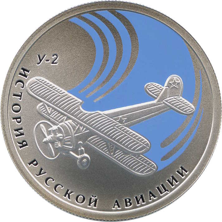 Описание: У центрі диска — зображення біплана з двома п'ятикутними зірками на фюзеляжі та хвостовому оперенні, за літаком на блакитному тлі — п'ять білих смуг у формі дуги, три смуги ліворуч і дві праворуч; ліворуч зверху, над крилом літака — горизонтальний напис: «У-2», ліворуч внизу по краю — напівкруглий напис: «ИСТОРИЯ РУССКОЙ АВИАЦИИ» (ІСТОРІЯ РОСІЙСЬКОЇ АВІАЦІЇ).