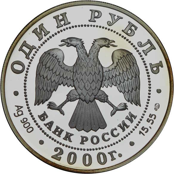 Описание: У центрі — емблема Банку Росії (двоголовий орел, розроблений І. Білібіним, нижче — напівкругла напис — «БАНК РОССИИ» (БАНК РОСІЇ), обрамлена колом з крапок і написів по краю: зверху — «ОДИН РУБЛЬ» (ОДИН РУБЛЬ), знизу — «2000», літери ліворуч позначають метал і пробу, праворуч — вміст дорогоцінного металу та знак монетного двору.