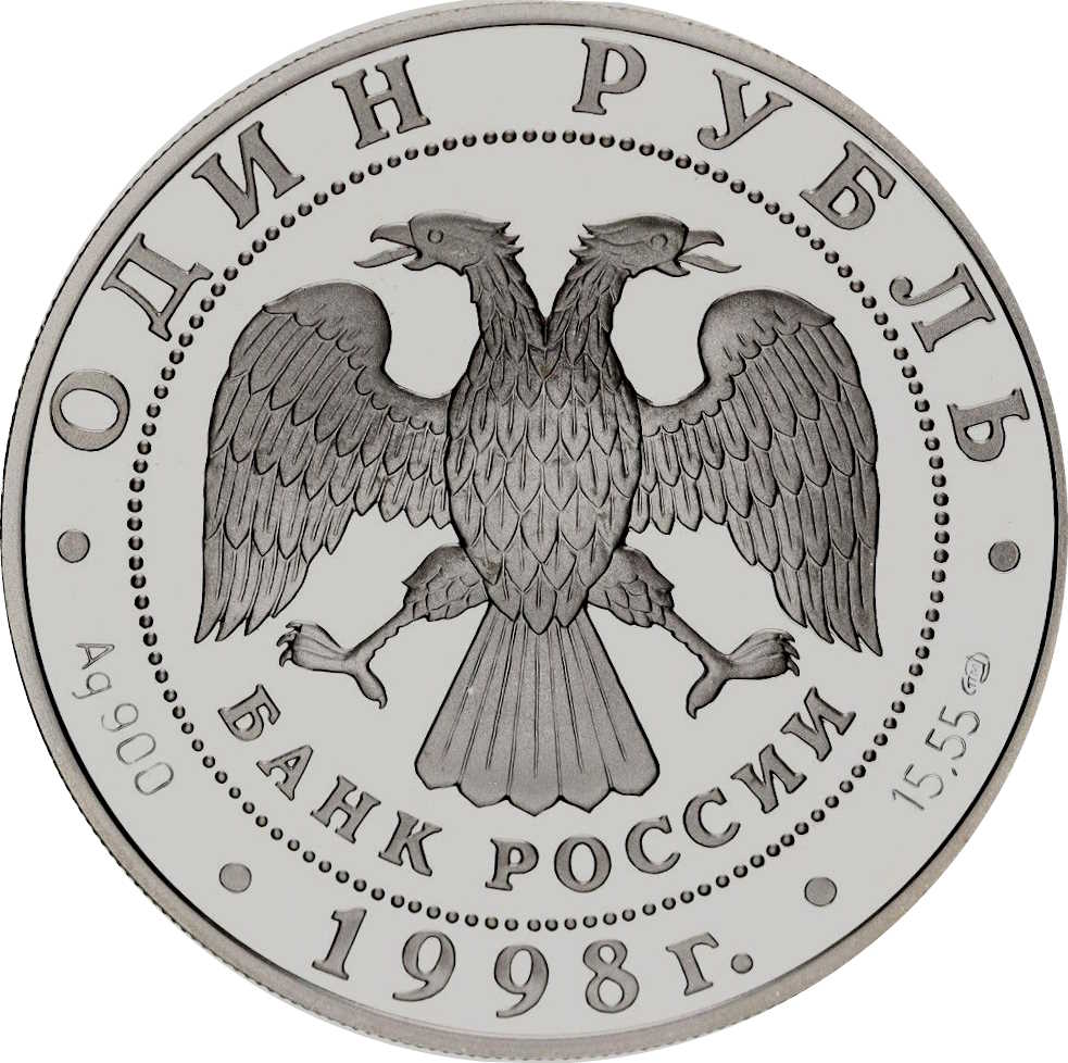 Описание: У центрі — емблема Банку Росії (двоголовий орел, створений І. Білібіним, нижче — напівкруглий напис «БАНК РОССИИ» (БАНК РОСІЇ), обрамлений колом з крапок і написів по краю: зверху — «ОДИН РУБЛЬ» (ОДИН РУБЛЬ), внизу — «1998», літери ліворуч позначають метал і пробу, праворуч — вміст дорогоцінного металу і знак монетного двору.