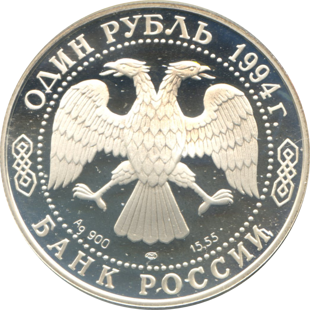 Описание: Двоголовий орел (за ескізом І. Білібіна), літери під ним позначають метал, пробу, знак монетного двору та вміст дорогоцінного металу. Написи по краю: зверху — «ОДИН РУБЛЬ 1994 г.» (ОДИН РУБЛЬ 1994), знизу — «БАНК РОССИИ» (БАНК РОСІЇ).