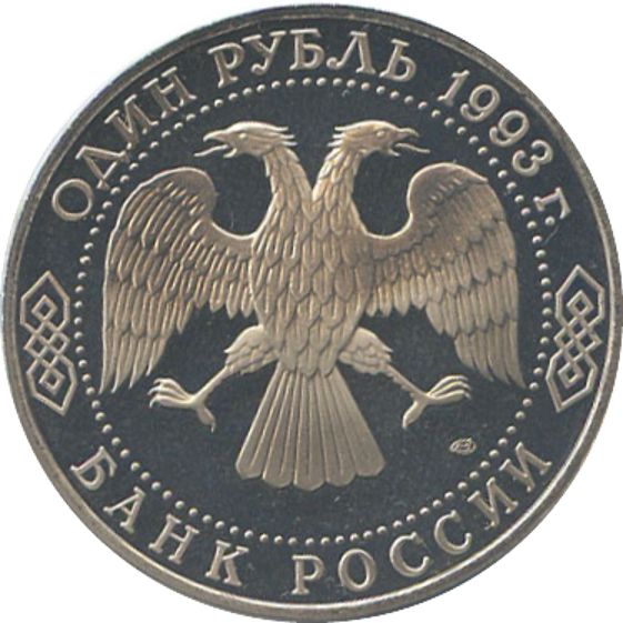 Описание: У центрі — емблема Банку Росії (двоголовий орел, розроблений І. Білібіним), під нею праворуч — знак монетного двору. Написи по краю обрамлені колом з крапок: зверху — «ОДИН РУБЛЬ 1993 г.» (ОДИН РУБЛЬ 1993), знизу — «БАНК РОССИИ» (БАНК РОСІЇ).