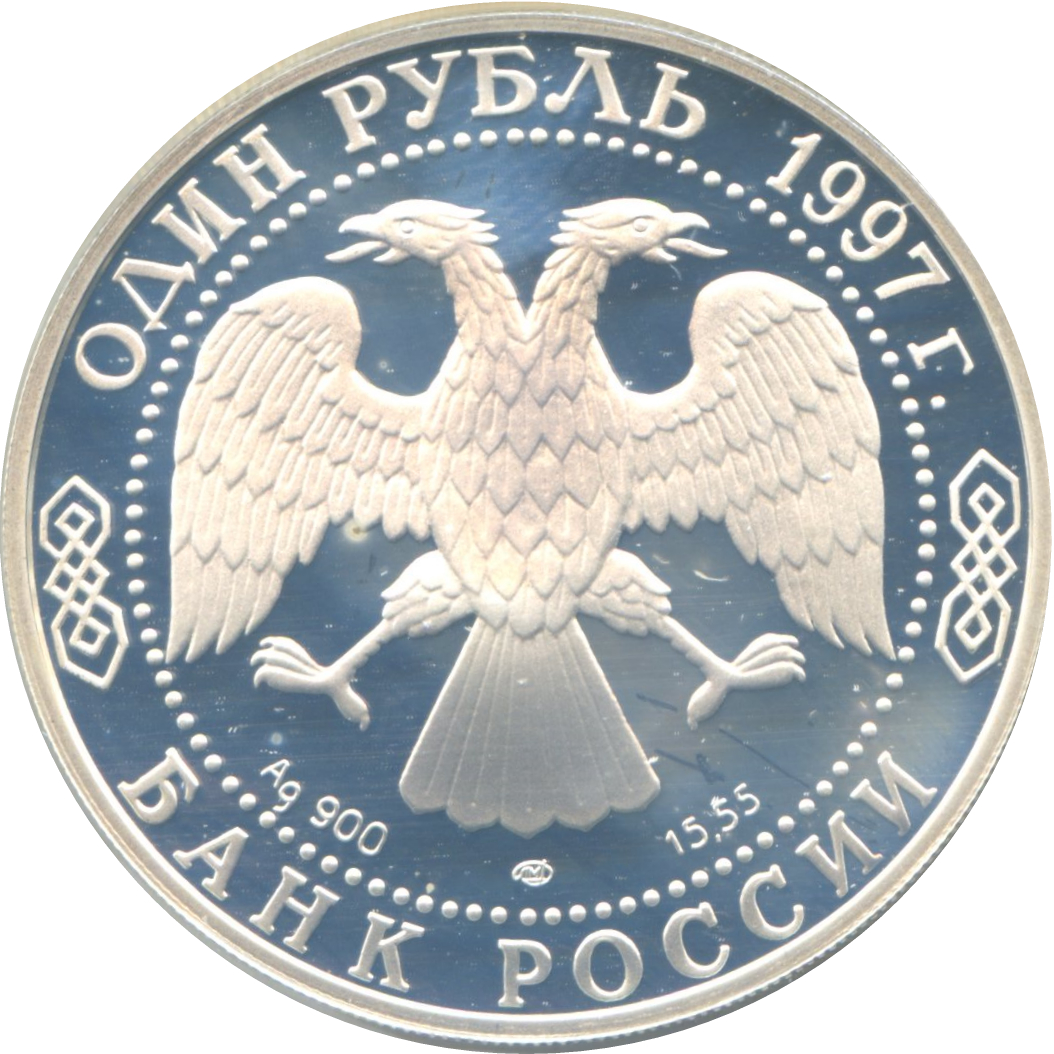 Описание: Двоголовий орел, створений художником І. Білібіним. Написи по краю: зверху — «ОДИН РУБЛЬ 1997 г.» (ОДИН РУБЛЬ 1997), знизу — «БАНК РОССИИ» (БАНК РОСІЇ). Літери нижче позначають металевий знак, пробу, вміст дорогоцінного металу та знак монетного двору.