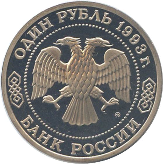 Описание: У центрі — емблема Банку Росії (двоголовий орел, розроблений І. Білібіним), під нею праворуч — знак монетного двору. Написи по краю обрамлені колом з крапок: зверху — «ОДИН РУБЛЬ 1993 г.» (ОДИН РУБЛЬ 1993), знизу — «БАНК РОССИИ» (БАНК РОСІЇ).