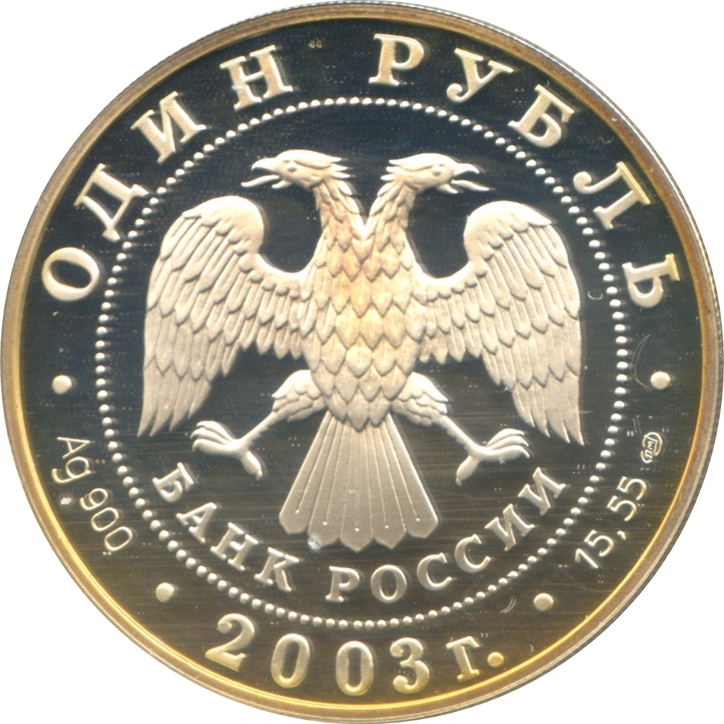 Описание: У центрі — емблема Банку Росії [двоголовий орел із розпростертими крилами, нижче — напівкругла напис — «БАНК РОССИИ» (БАНК РОСІЇ)] в обрамленні кола з крапок і написів по краю: зверху — «ОДИН РУБЛЬ», внизу - рік випуску «2003», літери ліворуч позначають метал і пробу, праворуч - вміст дорогоцінного металу і знак монетного двору.