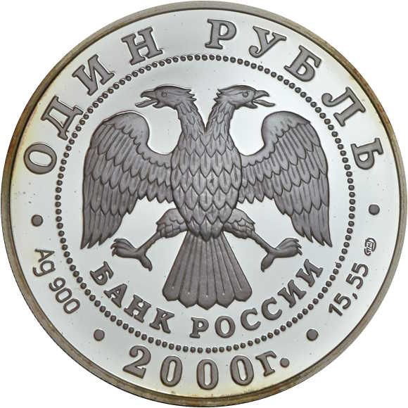 Описание: У центрі — емблема Банку Росії (двоголовий орел, створений І. Білібіним, нижче — напівкругла напис — «БАНК РОССИИ» (БАНК РОСІЇ), обрамлена колом з крапок, а по краю монети розміщені написи: у верхній частині — «ОДИН РУБЛЬ» (ОДИН РУБЛЬ), у нижній — «2000», літери ліворуч позначають метал і пробу, праворуч — вміст дорогоцінного металу та знак монетного двору.