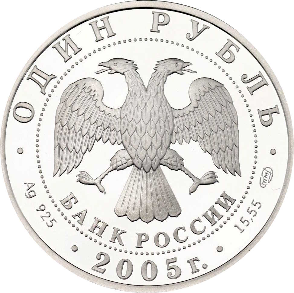 Описание: У центрі — емблема Банку Росії [двоголовий орел із розпростертими крилами, нижче — напівкругла напис — «БАНК РОССИИ» (БАНК РОСІЇ)] в обрамленні кола з крапок і написів уздовж краю: зверху — «ОДИН РУБЛЬ» (ОДИН РУБЛЬ), внизу – рік випуску «2005», літери ліворуч позначають метал і пробу, праворуч – вміст дорогоцінного металу і знак монетного двору.