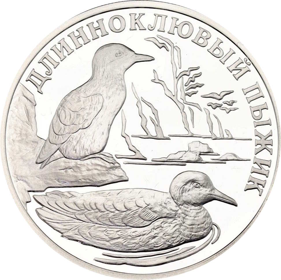Описание: Рельєфне зображення двох мармурових кайр. Напис по краю: «ДЛИННОКЛЮВЫЙ ПЫЖИК» (MARBLED MURRELET).