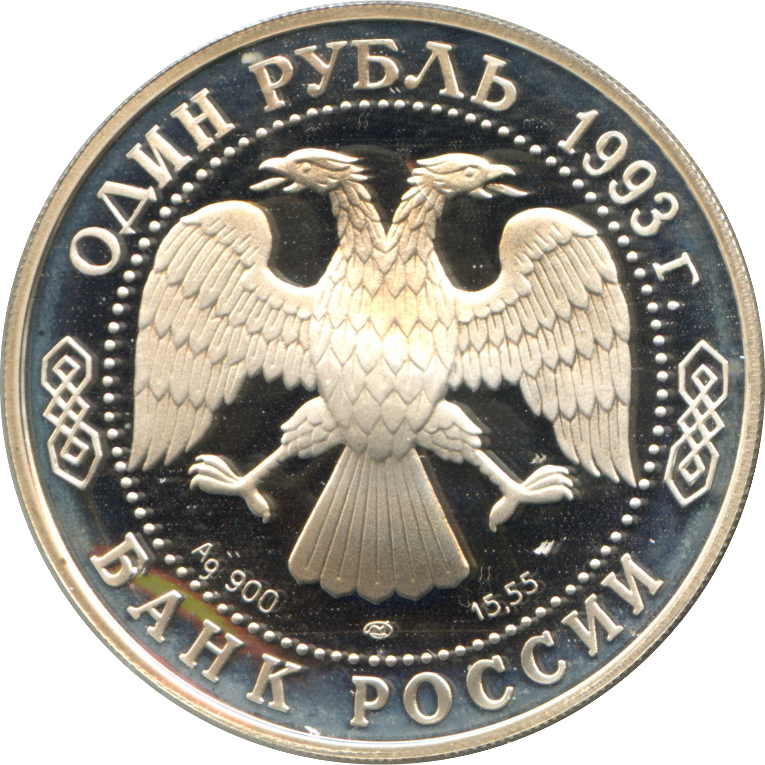Описание: У центрі — емблема Банку Росії (двоголовий орел, створений І. Білібіним), під нею літери, що позначають метал, пробу, знак монетного двору та вміст дорогоцінного металу. Написи по краю, обрамлені колом з крапок: зверху — «ОДИН РУБЛЬ 1993 г.» (ОДИН РУБЛЬ 1993), знизу — «БАНК РОССИИ» (БАНК РОСІЇ).