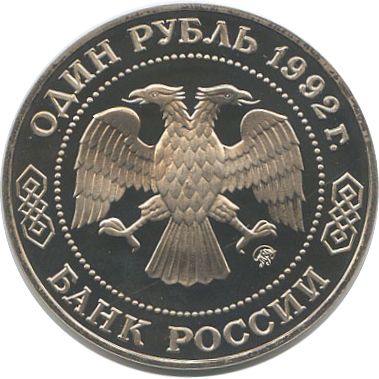 Описание: У центрі диска, в колі з крапками, — емблема Банку Росії (двоголовий орел із опущеними крилами), під нею праворуч — торгова марка монетного двору, по краю — напівкруглі написи, розділені двома фрагментами орнаменту, зверху — номінал і рік випуску: «ОДИН РУБЛЬ 1992», внизу: «БАНК РОССИИ».