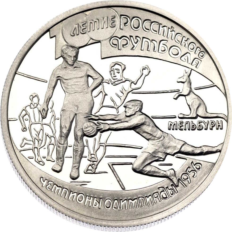 Описание: Фотографія футболістів під час фінального матчу СРСР — Югославія на Олімпійських іграх у Мельбурні 8 грудня 1956 року, який закінчився з рахунком 1:0 на користь радянської команди. Написи: під зображенням кенгуру — «МЕЛЬБУРН» (Мельбурн), внизу по краю — «ЧЕМПИОНЫ ОЛИМПИАДЫ. 1956», у верхній частині – «100-ЛЕТИЕ РОССИЙСКОГО ФУТБОЛА» (100-РІЧЧЯ ФУТБОЛУ В РОСІЇ).