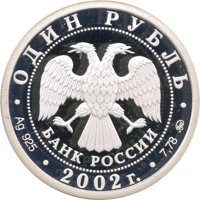Описание: У центрі — емблема Банку Росії [двоголовий орел із розпростертими крилами, нижче — напівкруглий напис «БАНК РОССИИ» (БАНК РОСІЇ)], обрамлена колом з крапок і написів по краю: зверху — «ОДИН РУБЛЬ», внизу — рік випуску «2002», літери ліворуч позначають метал і пробу, праворуч — вміст дорогоцінного металу і знак монетного двору.