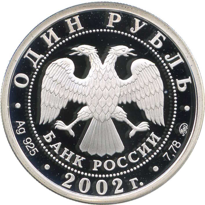 Описание: У центрі — емблема Банку Росії [двоголовий орел із розпростертими крилами, нижче — напівкруглий напис «БАНК РОССИИ» (БАНК РОСІЇ)], обрамлена колом з крапок і написів по краю: у верхній частині — «ОДИН РУБЛЬ», внизу - рік випуску «2002», літери ліворуч позначають метал і пробу, праворуч - вміст дорогоцінного металу і знак монетного двору.