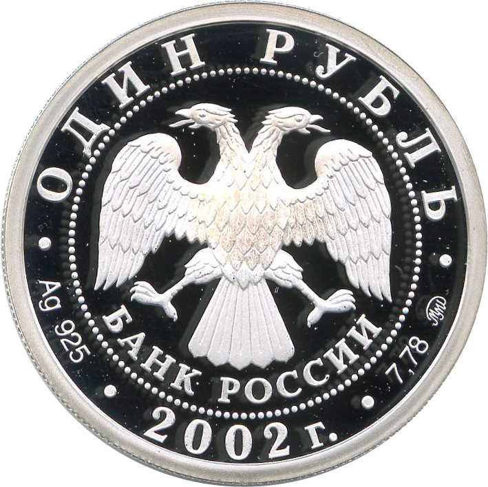 Описание: У центрі — емблема Банку Росії [двоголовий орел із розпростертими крилами, нижче — напівкруглий напис «БАНК РОССИИ» (БАНК РОСІЇ)], обрамлена колом з крапок і написів по краю: зверху — «ОДИН РУБЛЬ», внизу — рік випуску «2002», літери ліворуч позначають метал і пробу, праворуч — вміст дорогоцінного металу і знак монетного двору.