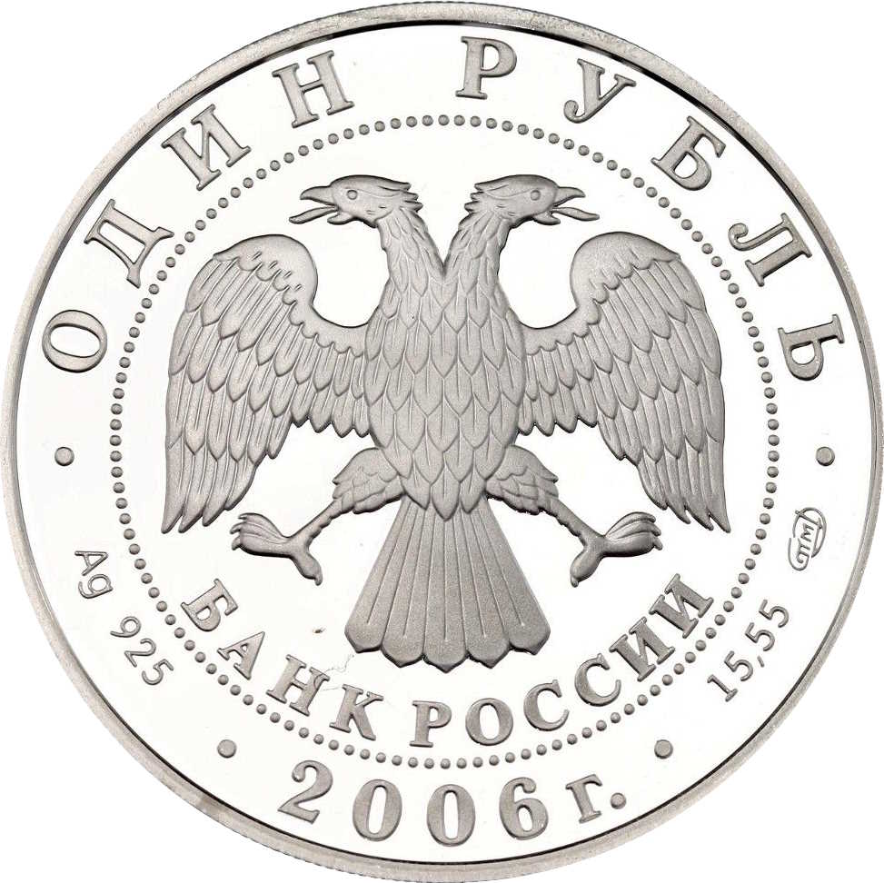 Описание: У центрі — емблема Банку Росії [двоголовий орел із розпростертими крилами, нижче — напівкругла напис — «БАНК РОССИИ» (БАНК РОСІЇ)] в обрамленні кола з крапок і написів по краю: зверху — «ОДИН РУБЛЬ» (ОДИН РУБЛЬ), внизу – рік випуску «2006», літери ліворуч позначають метал і пробу, праворуч – вміст дорогоцінного металу і знак монетного двору.