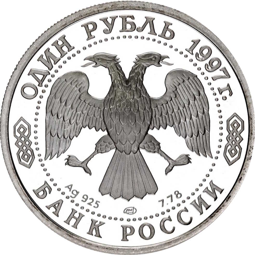 Описание: Двоголовий орел, створений художником І. Білібіним. Написи по краю: зверху — «ОДИН РУБЛЬ 1997 г.» (ОДИН РУБЛЬ 1997), знизу — «БАНК РОССИИ» (БАНК РОСІЇ). Літери нижче позначають металевий знак, пробу, вміст дорогоцінного металу та знак монетного двору.