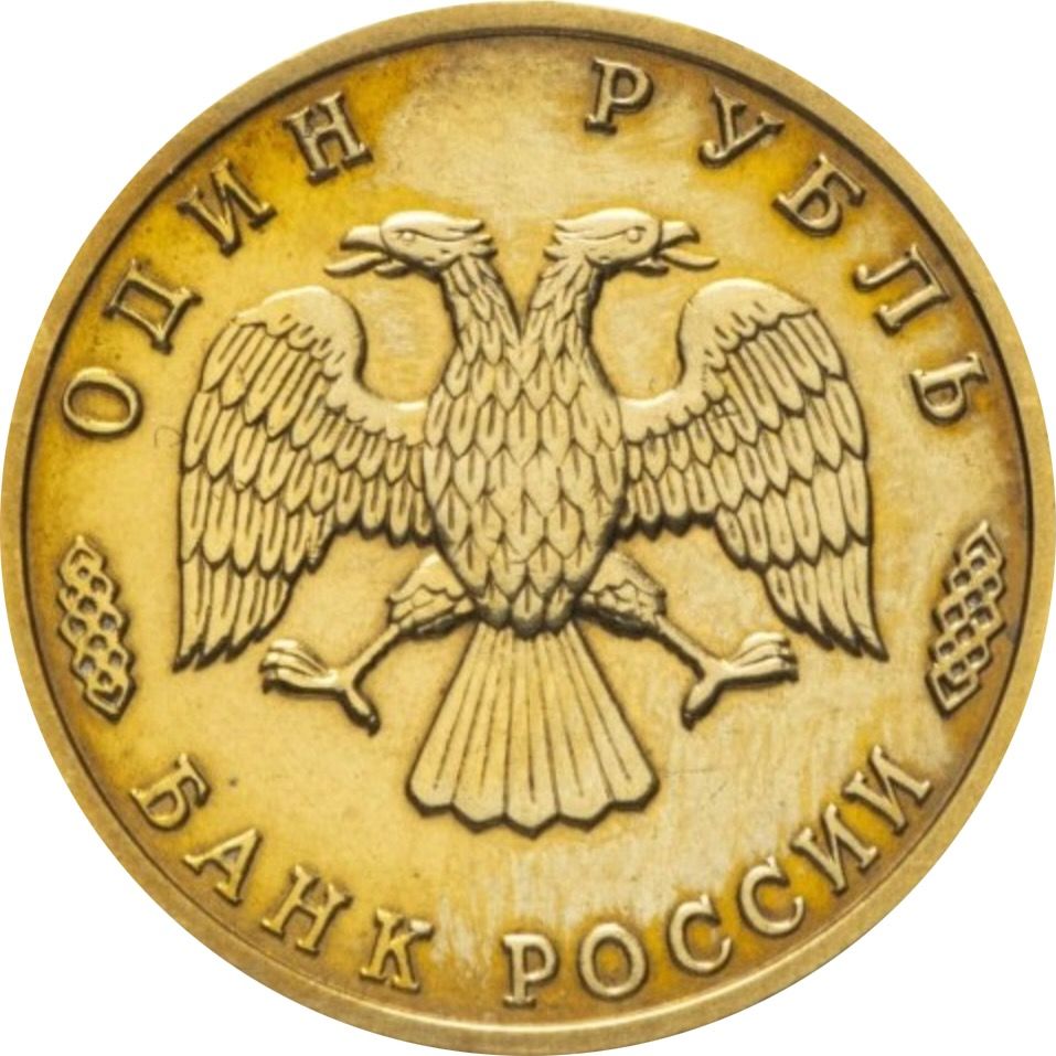 Описание: У центрі — емблема Банку Росії (двоголовий орел, створений художником І. Білібіним), написи по краю: зверху — «ОДИН РУБЛЬ», знизу — «БАНК РОССИИ».