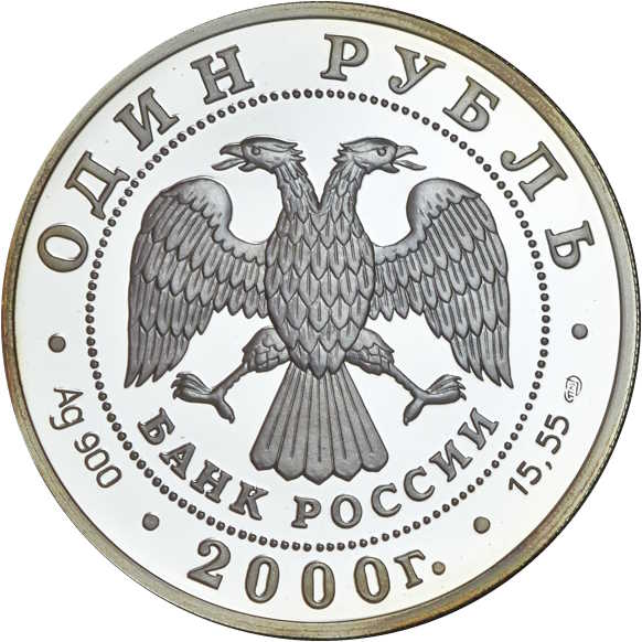 Описание: У центрі — емблема Банку Росії (двоголовий орел, створений І. Білібіним, нижче — напівкругла напис — «БАНК РОССИИ» (БАНК РОСІЇ), обрамлена колом з крапок, а по краю монети розміщені написи: зверху — «ОДИН РУБЛЬ» (ОДИН РУБЛЬ), знизу — «2000», літери ліворуч позначають метал і пробу, праворуч — вміст дорогоцінного металу та знак монетного двору.