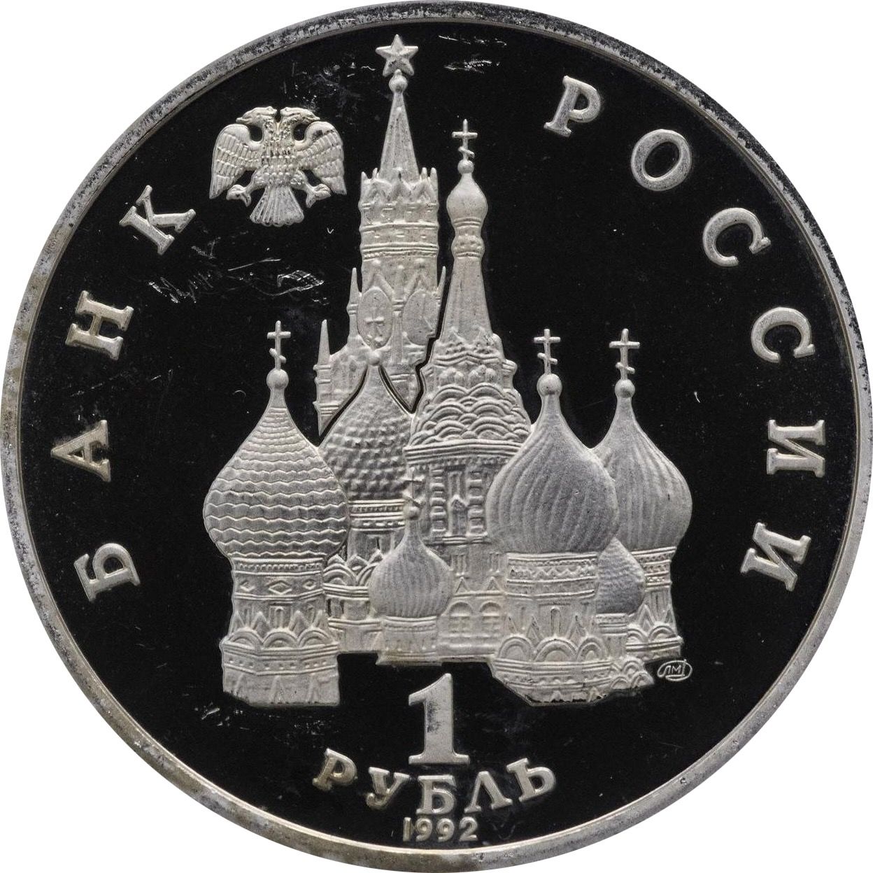 Описание: У центрі диска — рельєфне зображення куполів Покровського собору на Рововій площі на Красній площі та Спаської вежі Московського Кремля, ліворуч зверху — двоголовий орел із розпростертими крилами, під собором праворуч — знак монетного двору, внизу по центру, у три рядки — номінал і рік випуску: «1 РУБЛЬ 1992», по краю – напівкруглі написи, ліворуч: «БАНК», праворуч: «РОССИИ».