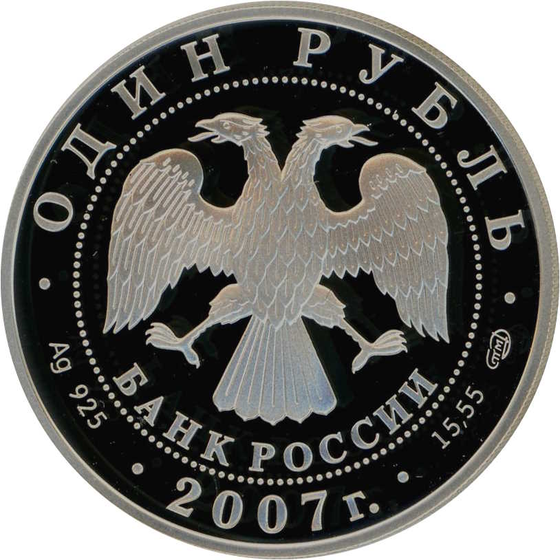 Описание: У центрі — емблема Банку Росії [двоголовий орел із опущеними крилами, під ним — напівкруглий напис «БАНК РОССИИ» (БАНК РОСІЇ)], обрамлена колом з крапок і написів по краю — зверху: «ОДИН РУБЛЬ» (ОДИН РУБЛЬ), знизу: ліворуч – позначення дорогоцінного металу та його проби, в центрі – рік випуску «2007 г.», праворуч – вміст дорогоцінного металу та знак монетного двору.