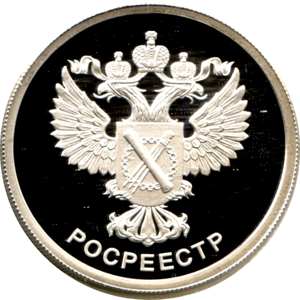 Описание: На дзеркальному полі диска рельєфне зображення емблеми Федеральної служби державної реєстрації, кадастру та картографії, внизу по краю напис «РОСРЕЕСТР» (ROSREESTR).