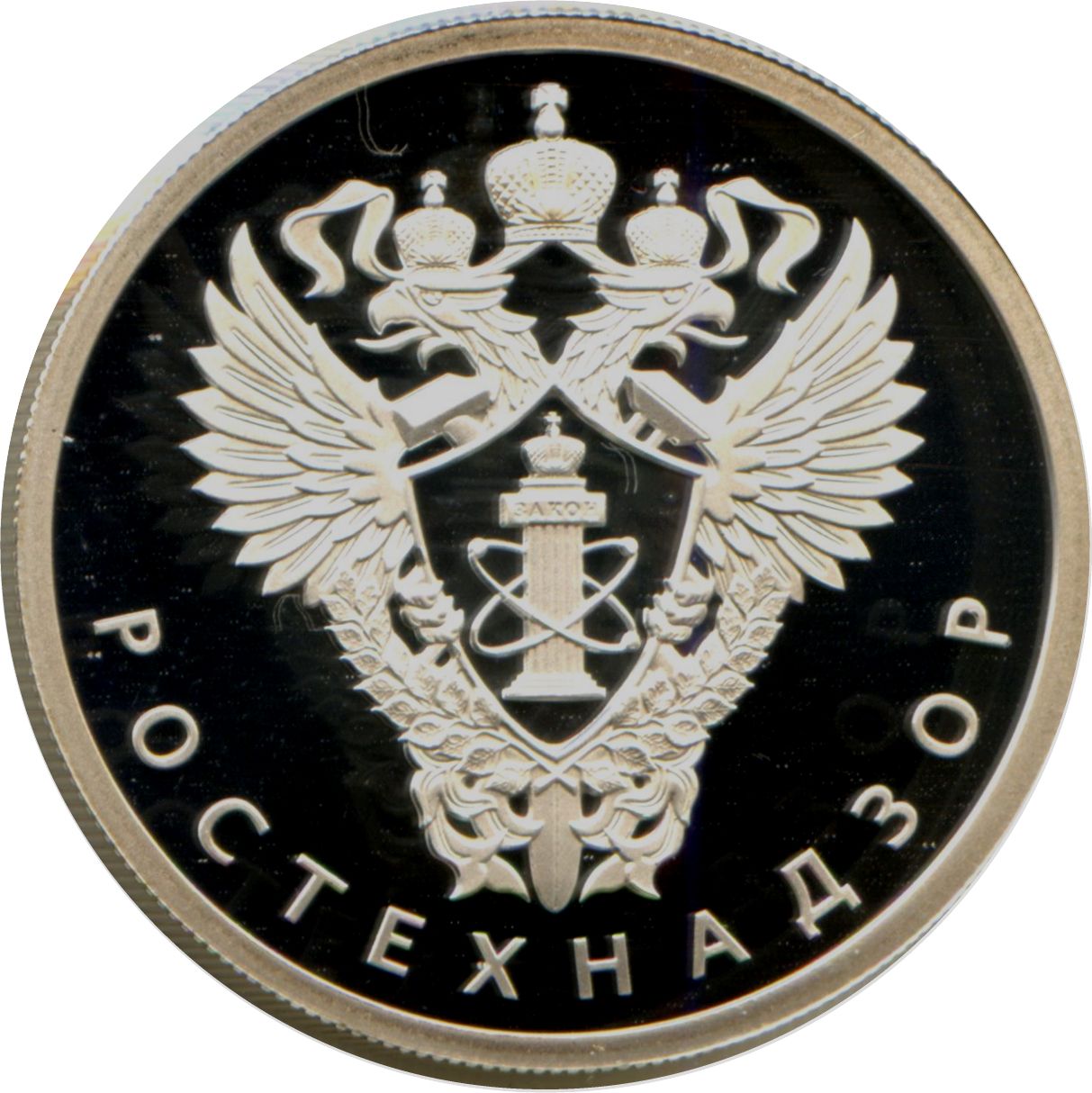 Описание: Рельєфне зображення емблеми Федеральної служби з екологічного, промислового та ядерного нагляду Росії (Ростехнадзор) та напівкруглий напис «РОСТЕХНАДЗОР» (ROSTECHNADZOR).