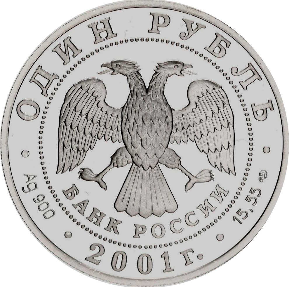 Описание: У центрі — емблема Банку Росії [двоголовий орел із розпростертими крилами, нижче — напівкруглий напис — «БАНК РОССИИ» (БАНК РОСІЇ)] в обрамленні кола з крапок і написів по краю: зверху — «ОДИН РУБЛЬ» (ОДИН РУБЛЬ), внизу — рік випуску «2001», літери ліворуч позначають метал і пробу, праворуч — вміст дорогоцінного металу і знак монетного двору.