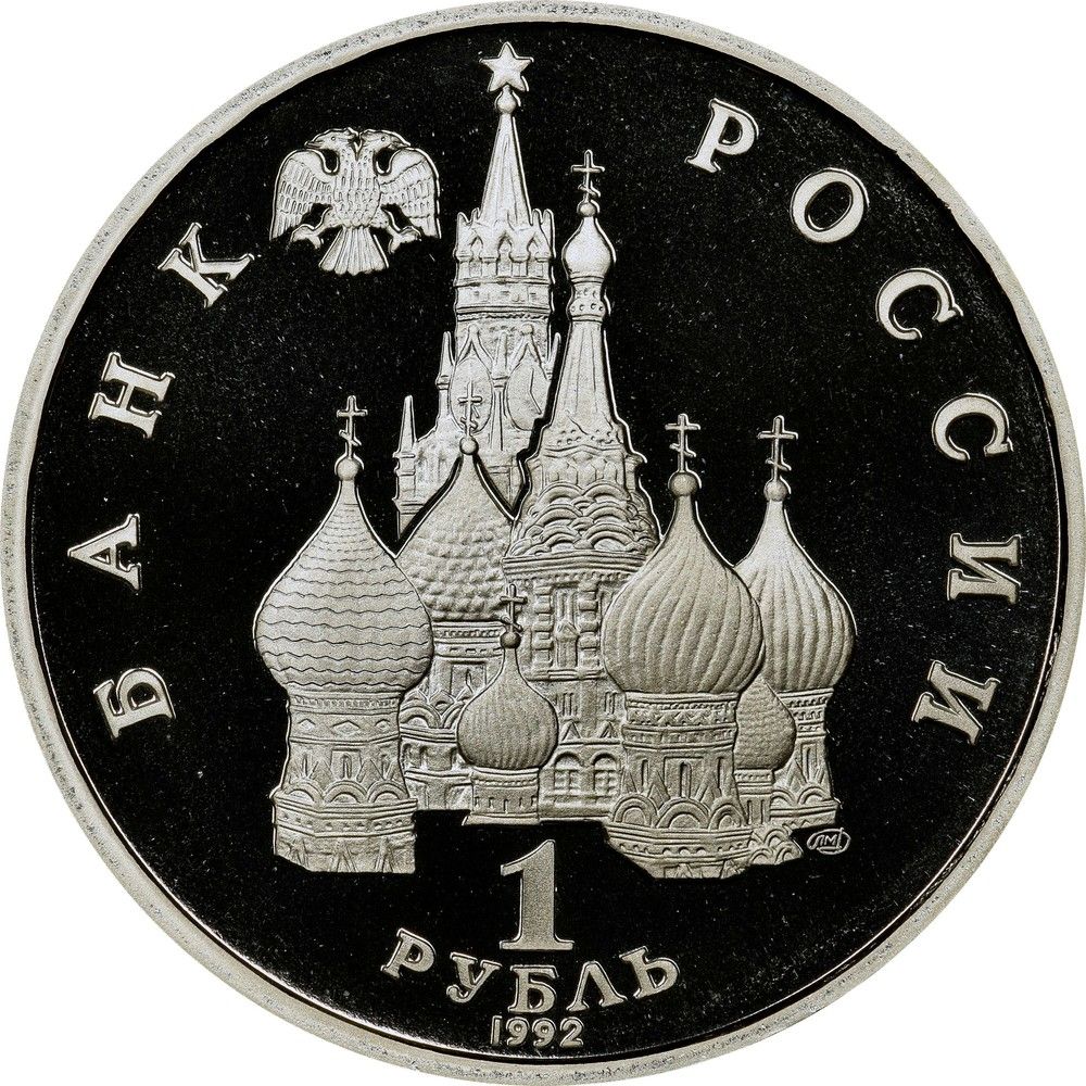 Описание: У центрі диска — рельєфне зображення куполів Покровського собору на Рові на Красній площі та Спаської вежі Московського Кремля, ліворуч зверху — двоголовий орел із розпростертими крилами, під собором праворуч — знак монетного двору, внизу по центру, у три рядки — номінал і рік випуску: «1 РУБЛЬ 1992», по краю – напівкруглі написи, ліворуч: «БАНК», праворуч: «РОССИИ».