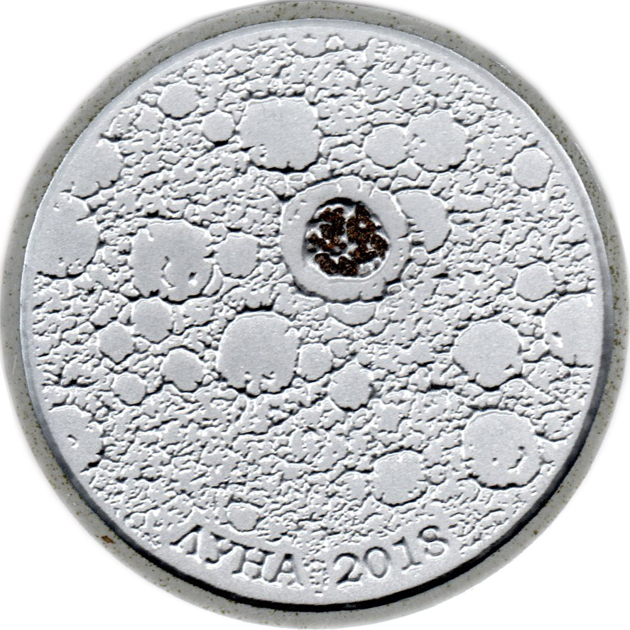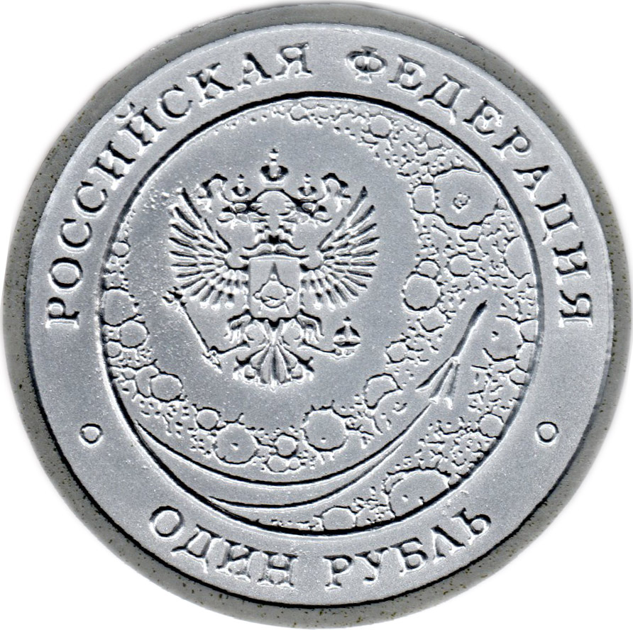 Описание: Зображення державного герба Російської Федерації на тлі поверхні Місяця. Є написи: «РОССИЙСКАЯ ФЕДЕРАЦИЯ» (РОСІЙСЬКА ФЕДЕРАЦІЯ), номінал монети — «ОДИН РУБЛЬ» (ОДИН РУБЛЬ).