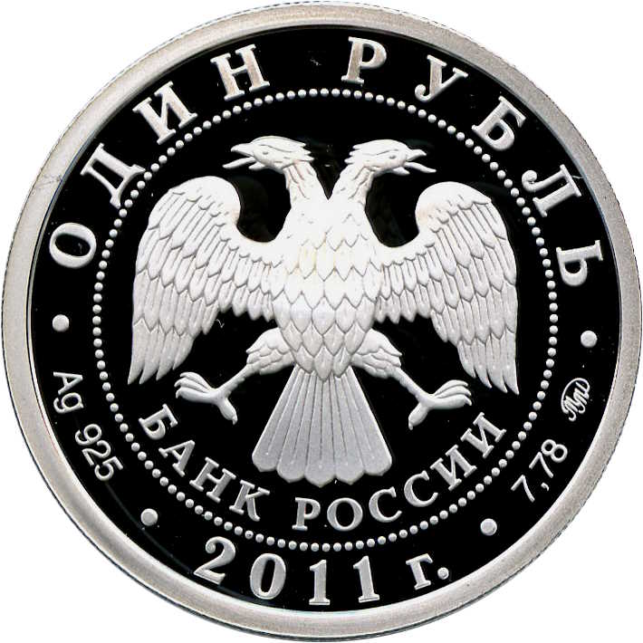 Описание: У центрі — емблема Банку Росії [двоголовий орел із опущеними крилами, під ним — напівкруглий напис «БАНК РОССИИ» (БАНК РОСІЇ)], обрамлена колом з крапок і написів по краю — зверху: «ОДИН РУБЛЬ», нижче: ліворуч - позначення дорогоцінного металу та його проби, в центрі - рік випуску «2011 г.», праворуч - вміст дорогоцінного металу та знак монетного двору.