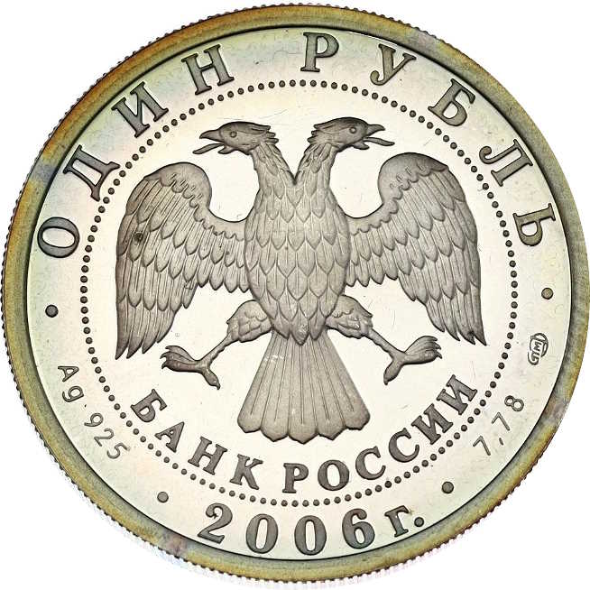 Описание: У центрі — емблема Банку Росії [двоголовий орел із розпростертими крилами, нижче — напівкругла напис — «БАНК РОССИИ» (БАНК РОСІЇ)] в обрамленні кола з крапок і написів по краю: зверху — «ОДИН РУБЛЬ» (ОДИН РУБЛЬ), внизу – рік випуску «2006», літери ліворуч позначають метал і пробу, праворуч – вміст дорогоцінного металу і знак монетного двору.
