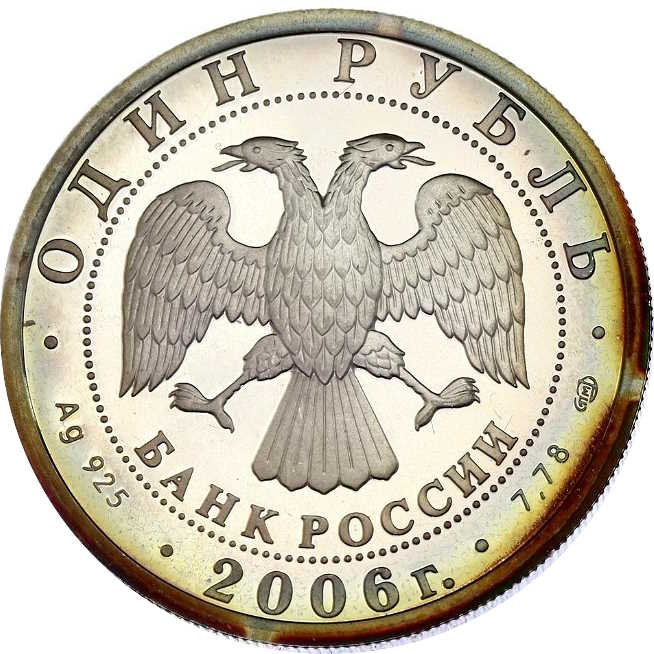 Описание: У центрі — емблема Банку Росії [двоголовий орел із опущеними крилами, нижче — напівкруглий напис — «БАНК РОССИИ» (БАНК РОСІЇ)] в обрамленні кола з крапок і написів по краю: зверху — «ОДИН РУБЛЬ» (ОДИН РУБЛЬ), внизу – рік випуску «2006», літери ліворуч позначають метал і пробу, праворуч – вміст дорогоцінного металу і знак монетного двору.
