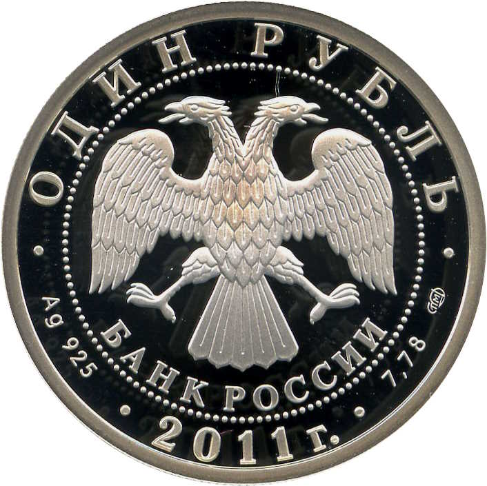 Описание: У центрі — емблема Банку Росії [двоголовий орел із розпростертими крилами, під ним — напівкруглий напис «БАНК РОССИИ» (БАНК РОСІЇ)], обрамлена колом з крапок, а по краю — написи: зверху: «ОДИН РУБЛЬ» (ОДИН РУБЛЬ), нижче: ліворуч - позначення дорогоцінного металу та його проби, в центрі - рік випуску «2011 г.» (2011), праворуч - вміст дорогоцінного металу та знак монетного двору.