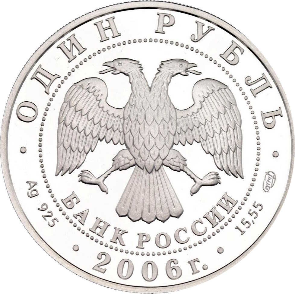 Описание: У центрі — емблема Банку Росії [двоголовий орел із розпростертими крилами, нижче — напівкруглий напис «БАНК РОССИИ» (БАНК РОСІЇ)] в обрамленні кола з крапок і написів по краю: зверху — «ОДИН РУБЛЬ» (ОДИН РУБЛЬ), внизу – рік випуску «2006», літери ліворуч позначають метал і пробу, праворуч – вміст дорогоцінного металу і знак монетного двору.