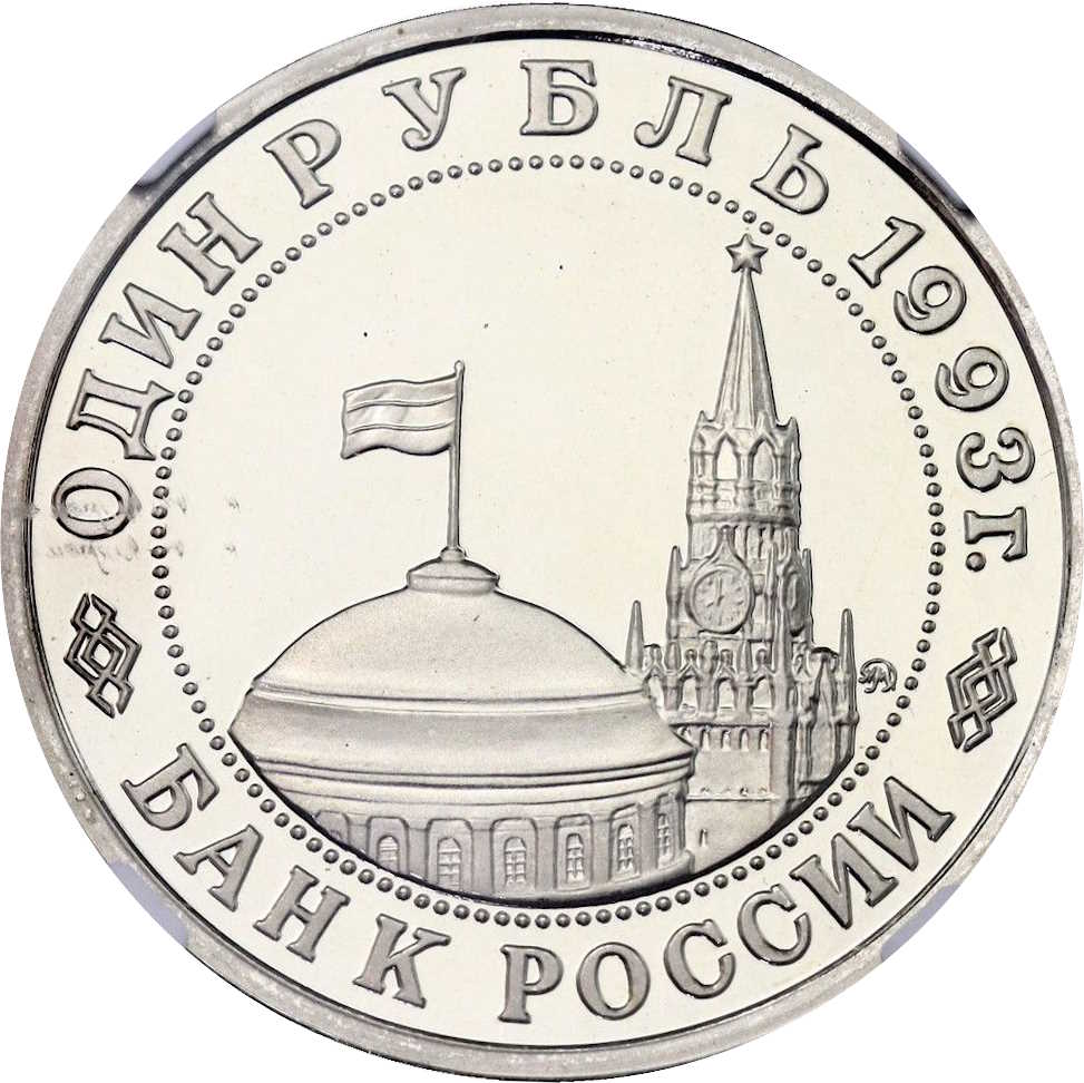 Описание: У центрі — вид на купол будівлі Сенату та Спаську вежу Московського Кремля, праворуч — знак монетного двору. Написи вздовж краю обрамлені колом з крапок: зверху — «ОДИН РУБЛЬ 1993 г.» (ОДИН РУБЛЬ 1993), знизу — «БАНК РОССИИ» (БАНК РОСІЇ).