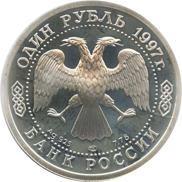 Описание: Двоголовий орел, створений художником І. Білібіним. Написи по краю: зверху — «ОДИН РУБЛЬ 1997 г.» (ОДИН РУБЛЬ 1997), знизу — «БАНК РОССИИ» (БАНК РОСІЇ). Літери нижче позначають метал, пробу, вміст дорогоцінного металу та знак монетного двору.